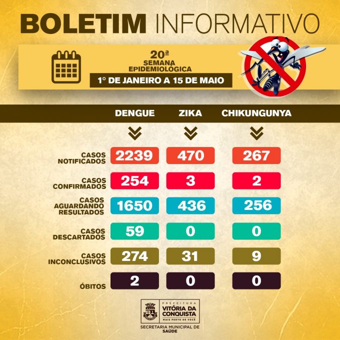 Nesta segunda-feira (18), o Centro de Controle de Endemias da Secretaria Municipal de Saúde divulga o segundo boletim semanal com os números atualizados da 20ª semana epidemiológica, que compreende o período de janeiro a 15 de maio de 2020. O levantamento mostra que já foram notificados em Vitória da Conquista, 2.976 casos suspeitos de Dengue, Zika ou Chikungunya – doenças transmitidas pelo mosquito Aedes aegypti.