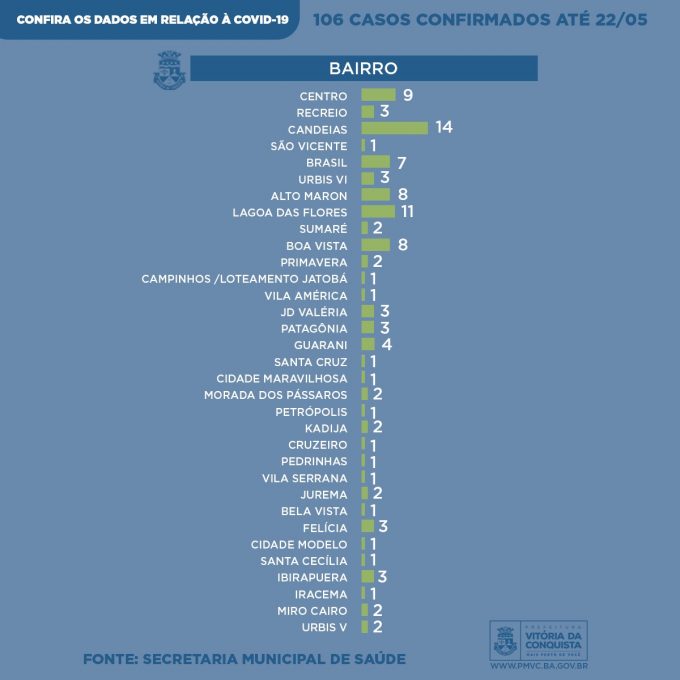 Até o último detalhamento realizado pela secretaria de saúde de Vitória da Conquista, o bairro Lagoa das Flores era o que mais havia registrado casos da Covid-19, com total de oito.