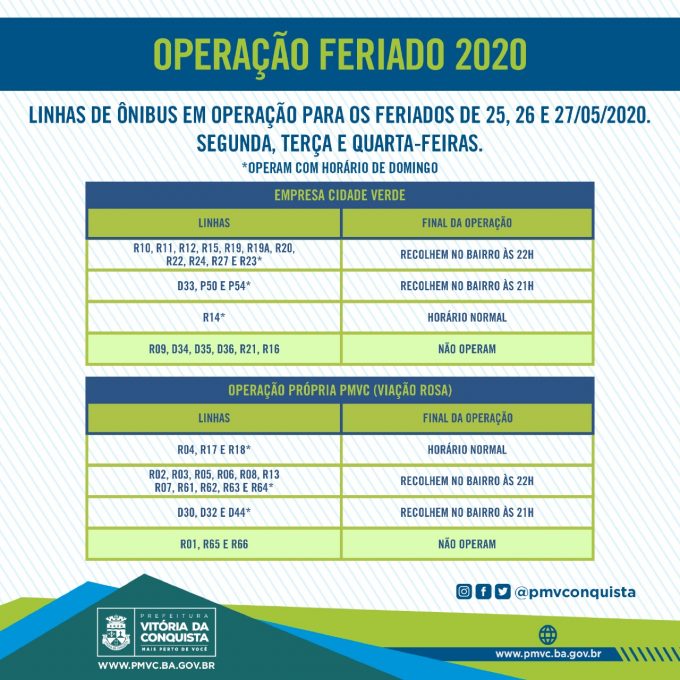 A Secretaria Municipal de Mobilidade Urbana informa que, devido à antecipação dos feriados para as próximas segunda (25), terça (26) e quarta-feira (27), os horários de algumas linhas do Transporte Coletivo Urbano vão ser alterados. Algumas passam a operar com a tabela de domingo e outras vão deixar de operar durante esse feriado.