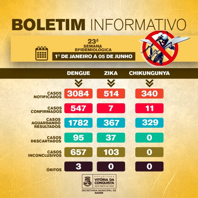 3084 pessoas foram notificadas com suspeita de Dengue. O número de casos confirmados após resultado laboratorial positivo subiu para 547. Outras 95 pessoas tiveram resultados descartados e 657 apresentaram diagnóstico inconclusivo em relação à doença. 1.782 pessoas aguardam resultado laboratorial e três pacientes, que eram residentes do município, faleceram por dengue grave hemorrágica.