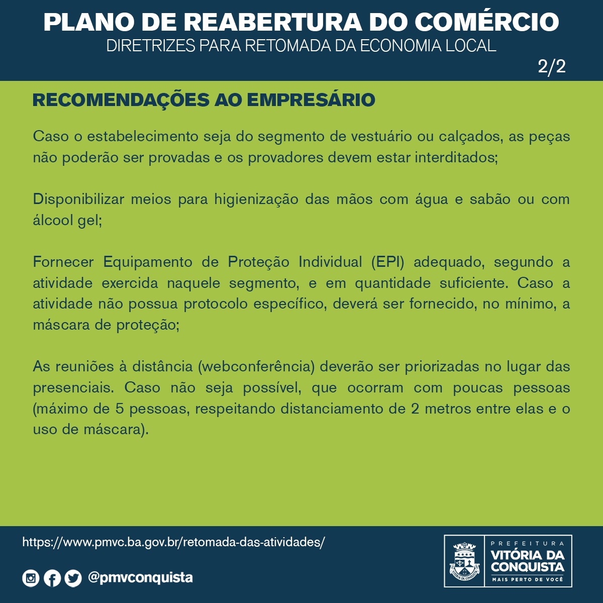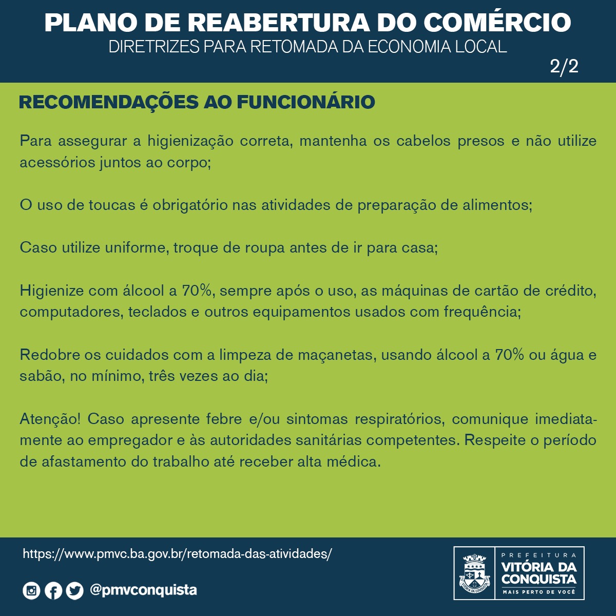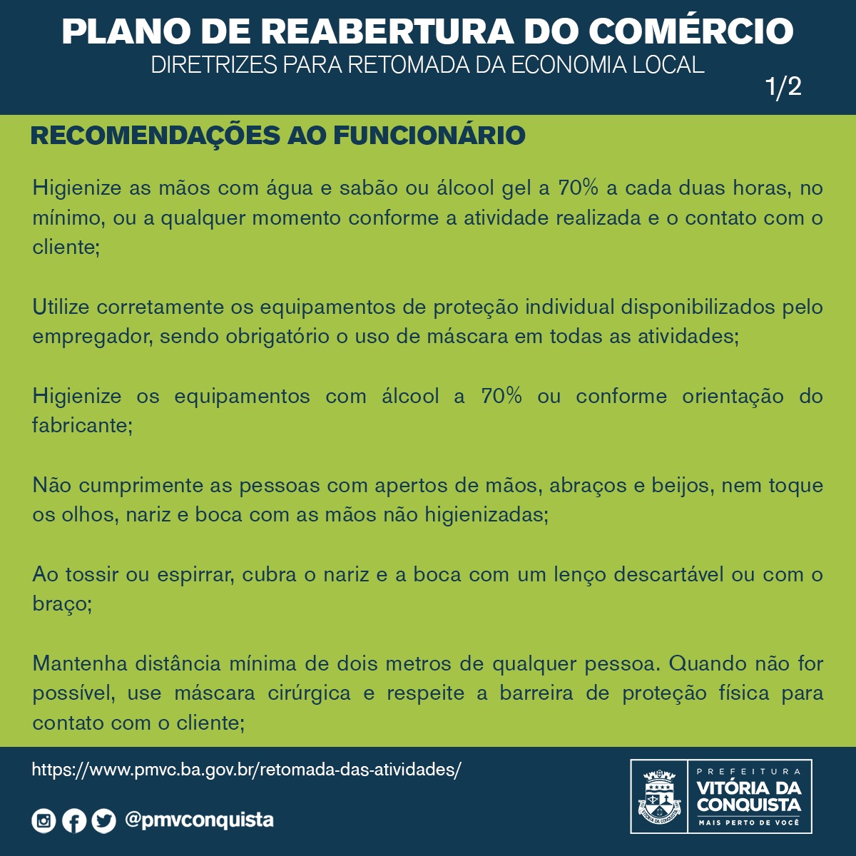 A prefeitura de Vitória da Conquista divulgou as recomendações que devem ser seguidas pelos empresários e funcionários das empresas que estão em funcionamento.