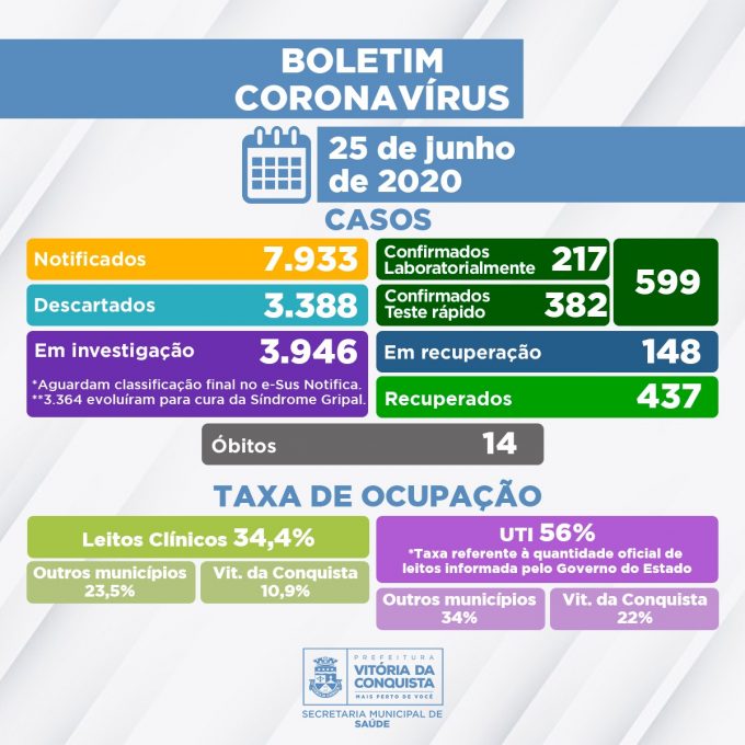 Nesta quinta-feira (25), mais 26 pessoas testaram positivo para Coronavírus em Conquista, elevando para 599 casos confirmados desde quando foram iniciadas as testagens, no fim do mês de fevereiro (382 pacientes apresentaram resultado positivo em Teste Rápido e 217 em exame laboratorial RT-PCR). Além disso, hoje, o número de pacientes recuperados subiu para 437 e outros 148 seguem em recuperação, ainda apresentando sintomas da infecção, sendo que nove deles estão internados e 139 em tratamento domiciliar.