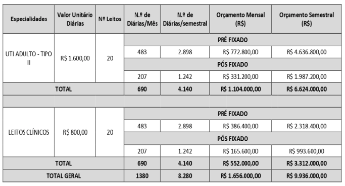 “A representação demonstra diárias de leitos do HCC, tanto clínicos, como de UTI, em quantidade acima da capacidade oferecida. O contrato firmado é de 20 leitos de UTI e 20 clínicos, o que daria, mensalmente, 600 diárias por cada tipo de leito, ou 1.200 diárias no total. Mas de acordo com o contrato, o Governo do Estado, tem pago 690 diárias, por leito de UTI e 690 diárias por leitos clínicos, representando, mensalmente, e pagando por isso, 1380 diárias, 180 a mais do que o número de leitos disponibilizados à população”, informou a nota. A prefeitura divulgou uma tabela apresentada no próprio contrato elaborado pela Secretaria de Saúde do Estado: