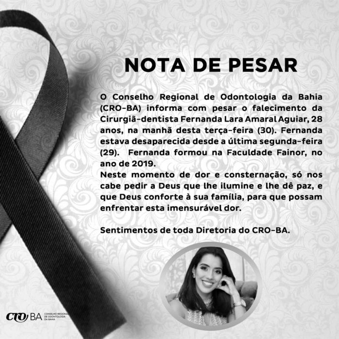 O Conselho Regional de Odontologia da Bahia emitiu uma nota de pesar pela morte da dentista Fernanda Lara Amaral Aguiar, de 28 anos.