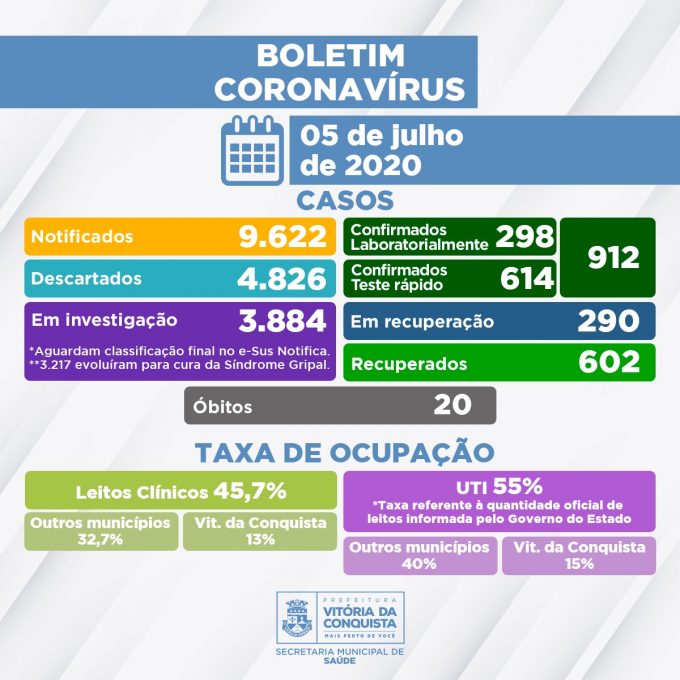 Neste domingo (5), foram confirmadas mais 10 pessoas contaminadas com a Covid-19, totalizando 912 casos confirmados no município. O número de recuperados chegou a 602 e 290 pacientes seguem em recuperação (15 internados e 275 em tratamento domiciliar).