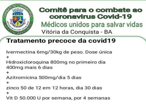 Um card que está circulando nas redes sociais sobre um suposto um “Tratamento precoce da Covid-19” tem o brasão de Vitória da Conquista.