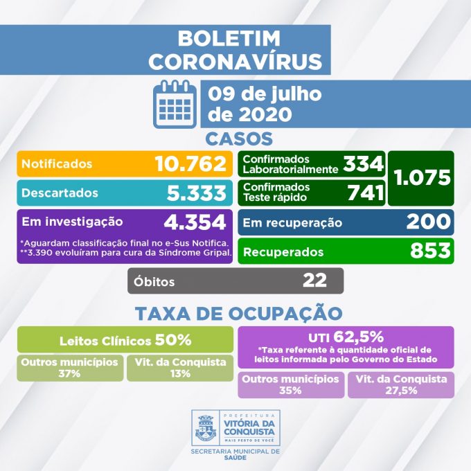 Ocupação dos leitos – A rede SUS do município dispõe, neste momento, de 86 leitos apenas para tratamento da Covid-19, sendo 46 enfermarias e 40 leitos de UTI. Em parte deles estão internados, nesta quinta (9), 48 pacientes que são residentes de Vitória da Conquista e também de outros 20 municípios da macrorregião: Jaguaquara, Jânio Quadros, Iguaí, Malhada de Pedras, Belo Campo, Eunápolis, Itapebí, Valença, Jequié, Planalto, Livramento de Nossa Senhora, Ibicuí, Anagé, Cordeiros, Brumado, Ilhéus, Itapetinga, Barra do Choça, Poções e Piripá.