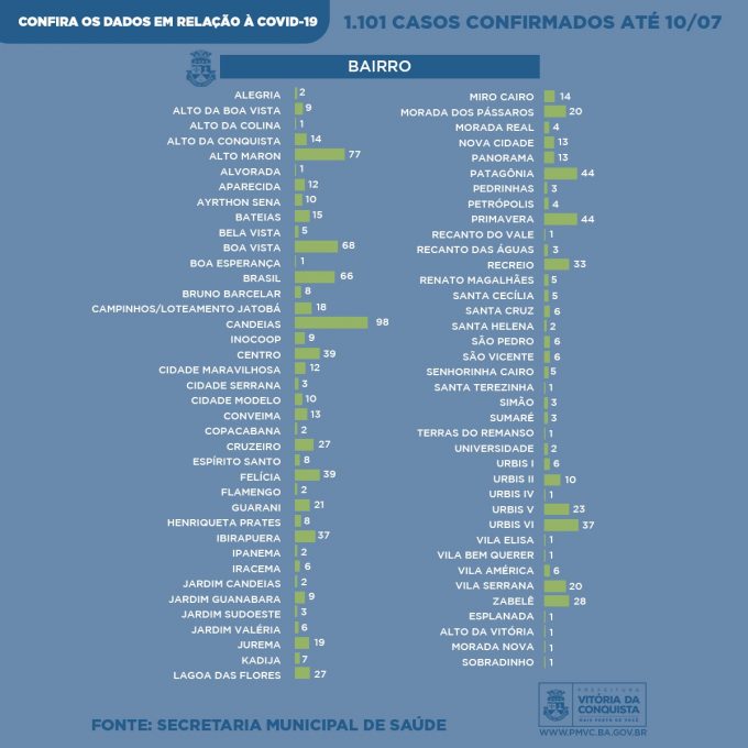 Os demais casos confirmados são de pessoas residentes das seguintes localidades da zona urbana: Alegria (2), Alto da Boa Vista (9), Alto da Colina (1), Alto da Conquista (14), Alto Maron (77), Alto da Vitória (1), Alvorada (1), Aparecida (12), Ayrton Sena (10), Bateias (15), Bela Vista (5), Boa vista (68), Boa Esperança (1), Brasil (66), Bruno Barcelar (8), Campinhos/Loteamento Jatobá (18), Candeias (98), Centro (39), Cidade maravilhosa (12), Cidade Serrana (3), Cidade Modelo (10), Conveima (13), Copacabana (2), Cruzeiro (27), Espírito Santo (8), Esplanada (1), Felícia (39), Flamengo (2), Guarani (21), Henriqueta Prates (8), Inocoop (9), Ibirapuera (37), Ipanema (2), Iracema (6), Jardim Candeias (2), Jardim Guanabara (9), Jardim Sudoeste (3), Jardim Valeria (6), Jurema (19), Kadija (7), Lagoa das Flores (27), Miro Cairo (14), Morada dos Pássaros (20), Morada Real (4), Morada Nova (1), Nova Cidade (13), Panorama (13), Patagônia (44), Pedrinhas (3), Petrópolis (4), Primavera (44), Recanto das Águas (3), Recanto do Vale (1), Recreio (33), Renato Magalhães (5), Santa Cecília (5), Santa Cruz (6), Santa Helena (2), São Pedro (6), São Vicente (6), Santa Terezinha (1), Senhorinha Cairo (5), Simão (3), Sobradinho (1), Sumaré (3), Terras do Remanso (1), Universidade (2), Urbis I (6), Urbis II (10), Urbis IV (1), Urbis V (23), Urbis VI (37), Vila Elisa (1), Vila América (6), Vila Bem Querer (1), Vila Serrana (20) e Zabelê (28).