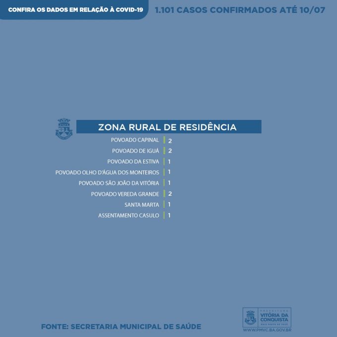 Segundo o último detalhamento de casos de coronavírus, divulgado pela secretaria de saúde de Conquista, 11 dos 1.101 pacientes estão na zona rural: Capinal (2), Iguá (2), São João da Vitória (1), Periperi (1), Povoado da Estiva (1), Povoado Olho d’Água dos Monteiros (1), Vereda Grande (2), Santa Marta (1) e Assentamento Casulo (1).
