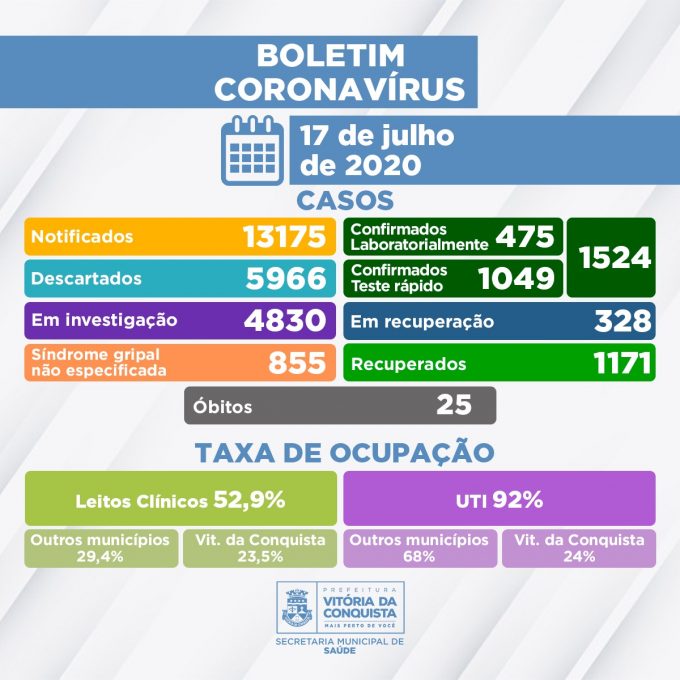 O número de casos confirmados por Covid-19 no município chegou a 1.524, nesta sexta-feira (17). Mais 205 pessoas que testaram positivo recuperaram-se da doença, registrando o total de 1.171 pessoas recuperadas. Outros 328 pacientes permanecem em recuperação (27 internados e 301 em tratamento domiciliar) e 25 pessoas residentes do município evoluíram para óbito.