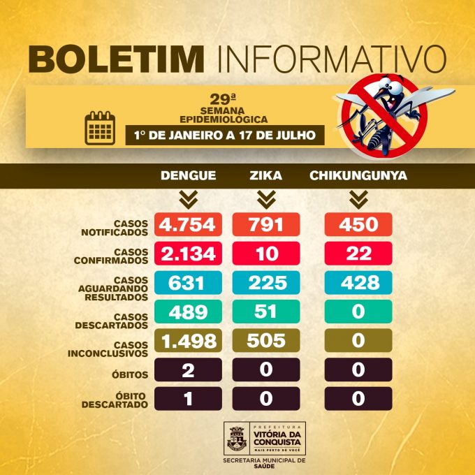 Do início do mês de janeiro até a última sexta-feira (17), foram registradas 5.995 notificações de pessoas com suspeita de contaminação por arboviroses – Dengue, Zika ou Chikungunya – em Vitória da Conquista. Ao longo da última semana, o Centro de Controle de Endemias notificou 223 novos casos e traz atualização do Boletim Informativo Semanal.