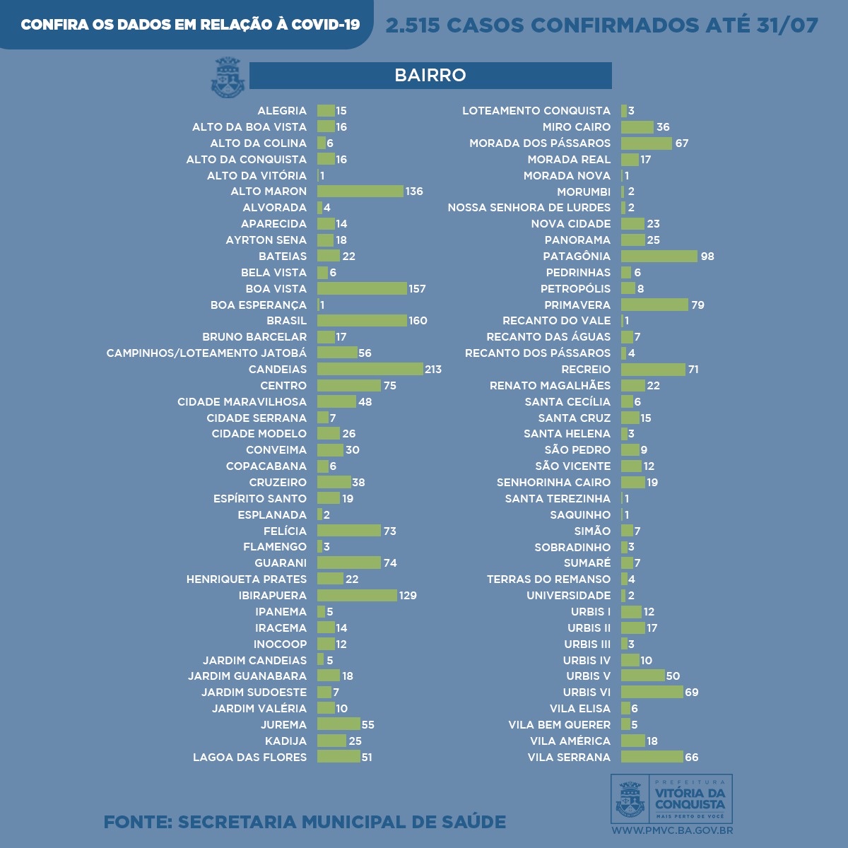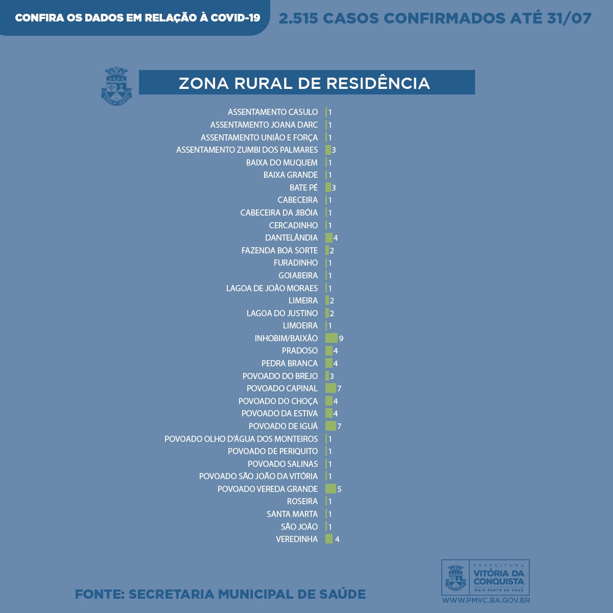 Os outros 2429 casos confirmados são de pessoas residentes da zona urbana: Alegria (15), Alto da Boa Vista (16), Alto da Colina (6), Alto da Conquista (16), Alto Maron (136), Alto da Vitória (1), Alvorada (4), Aparecida (14), Ayrton Sena (18), Bateias (22), Bela Vista (6), Boa vista (157), Boa Esperança (1), Brasil (160), Bruno Barcelar (17), Campinhos/Loteamento Jatobá (56), Candeias (213), Centro (75), Cidade Maravilhosa (48), Cidade Serrana (7), Cidade Modelo (26), Conveima (30), Copacabana (6), Cruzeiro (38), Espírito Santo (19), Esplanada (2), Felícia (73), Flamengo (3), Guarani (74), Henriqueta Prates (22), Inocoop (12), Ibirapuera (129), Ipanema (5), Iracema (14), Jardim Candeias (5), Jardim Guanabara (18), Jardim Sudoeste (7), Jardim Valéria (10), Jurema (55), Kadija (25), Lagoa das Flores (51), Loteamento Conquista (3), Miro Cairo (36), Morada dos Pássaros (67), Morada Real (17), Morada Nova (1), Morumbi (2), Nossa Senhora de Lurdes (2), Nova Cidade (23), Panorama (25), Patagônia (98), Pedrinhas (6), Petrópolis (8), Primavera (79), Recanto do Vale (1), Recanto das Águas (7), Recanto dos Pássaros (4), Recreio (71), Renato Magalhães (22), Santa Cecília (6), Santa Cruz (15), Santa Helena (3), São Pedro (9), São Vicente (12), Senhorinha Cairo (12), Santa Terezinha (1), Saquinho (1), Simão (7), Sobradinho (3), Sumaré (7), Terras do Remanso (4), Universidade (2), Urbis I (12), Urbis II (17), Urbis III (3), Urbis IV (10), Urbis V (50), Urbis VI (69), Vila Elisa (6), Vila América (18), Vila Bem Querer (5) e Vila Serrana (66).
