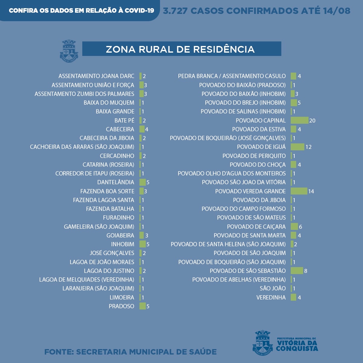 Já na zona rural do município foram diagnosticadas 159 pessoas, residentes das seguintes localidades: Assentamento Joana Darc (2), Assentamento União e Força (3), Assentamento Zumbi dos Palmares (3), Baixa do Muquem (1), Baixa Grande (1), Bate pé (2), Cabeceira (4), Corredor de Itaipu – Roseira (1), Catarina – Roseira (1), Cabeceira da Jiboia (2), Cercadinho (2), Cachoeira das Araras – São Joaquim (1), Dantelândia (5), Fazenda Boa sorte (3), Fazenda Lagoa Danta (1), Fazenda Batalha (1), Furadinho (1), Gameleira – São Joaquim (1), Goiabeira (3), Inhobim (5), José Gonçalves (2), Lagoa de João Moraes (1), Lagoa do Justino (2), Lagoa de Melquiades – Veredinha (1), Limoeira (1), Laranjeira – São Joaquim (1), Pradoso (5), Povoado do Baixão – Pradoso (1), Pedra Branca/Assentamento Casulo (4), Povoado do Brejo – Inhobim (5), Povoado do Baixão – Inhobim (3), Povoado Salinas – Inhobim (1), Povoado Capinal (20), Povoado de Boqueirão – José Gonçalves (1), Povoado do Choça (4), Povoado da Estiva (4), Povoado de Iguá (12), Povoado Olho d’agua dos Monteiros (1), Povoado de Periquito (1), Povoado São João da Vitória (1), Povoado Vereda Grande (14), Povoado da Jiboia (1), Povoado Campo Formoso (1), Povoado São Mateus (1), Povoado Caiçara (6), Povoado de Santa Marta (4), Povoado de Santa Helena – São Joaquim (1), Povoado de São Joaquim (1), Povoado de Boqueirão – São Joaquim (1), Povoado de São Sebastião (8), Povoado de Abelhas – Veredinha (1), São João (1) e Veredinha (4).