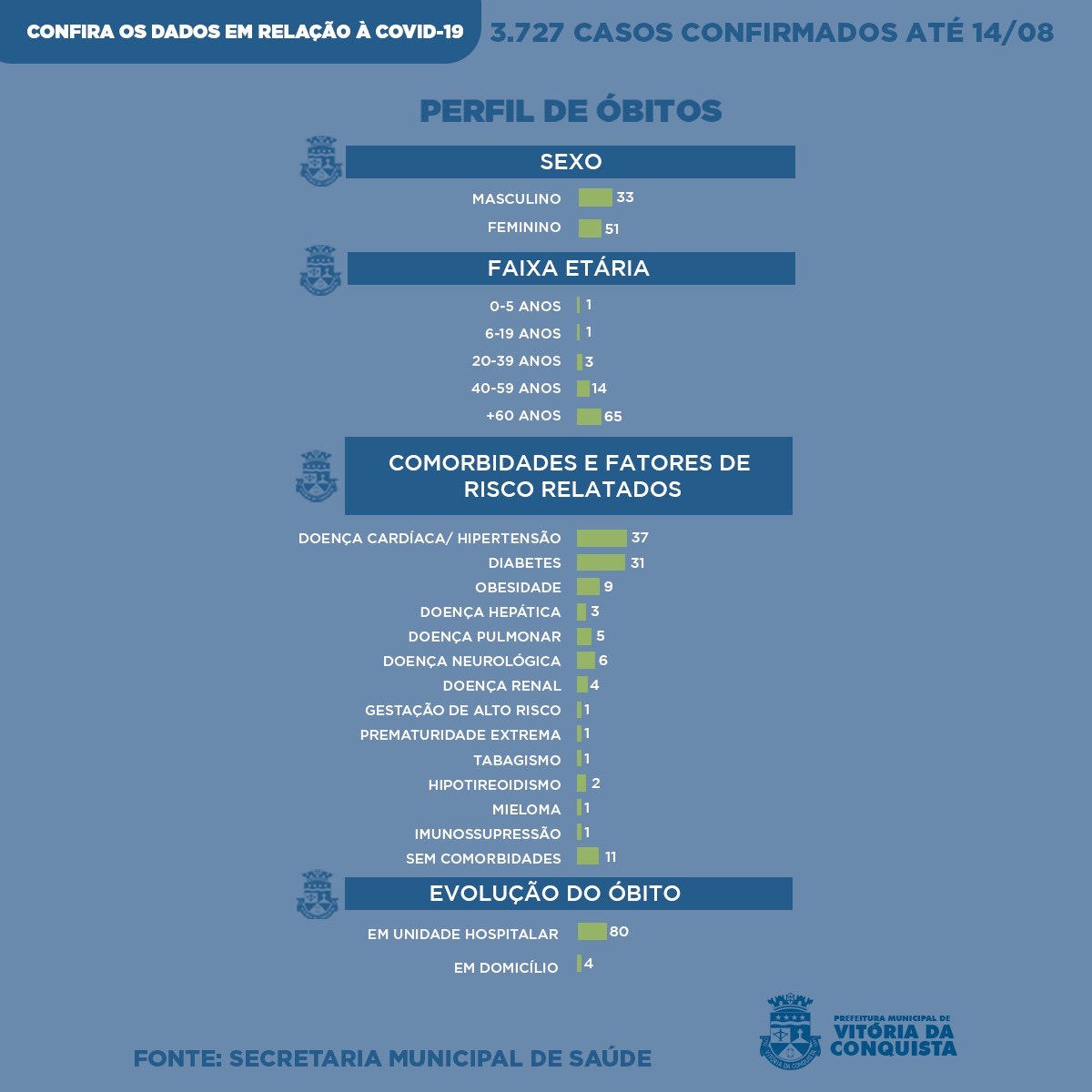 Desses pacientes que foram a óbito, 11 não tinham nenhum tipo de comorbidade e 73 possuíam doenças preexistentes e/ou fatores de risco como: Doença Cardíaca/Hipertensão (37), Diabetes (31), Obesidade (9), Doença Hepática (3), Doença Pulmonar (5), Doença Neurológica (6), Doença Renal (4), Gestação de alto risco (1), Prematuridade extrema (1), Tabagismo (1), Hipotireoidismo (2), Mieloma (1) e Imunossupressão (1).