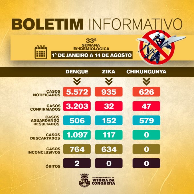 ZIKA – Foram notificados 935 casos suspeitos nesse período, com 32 deles confirmados laboratorialmente e 117 descartados. Outros 634 que apresentaram diagnóstico inconclusivo para a doença e 152 pessoas seguem aguardando resultado laboratorial.