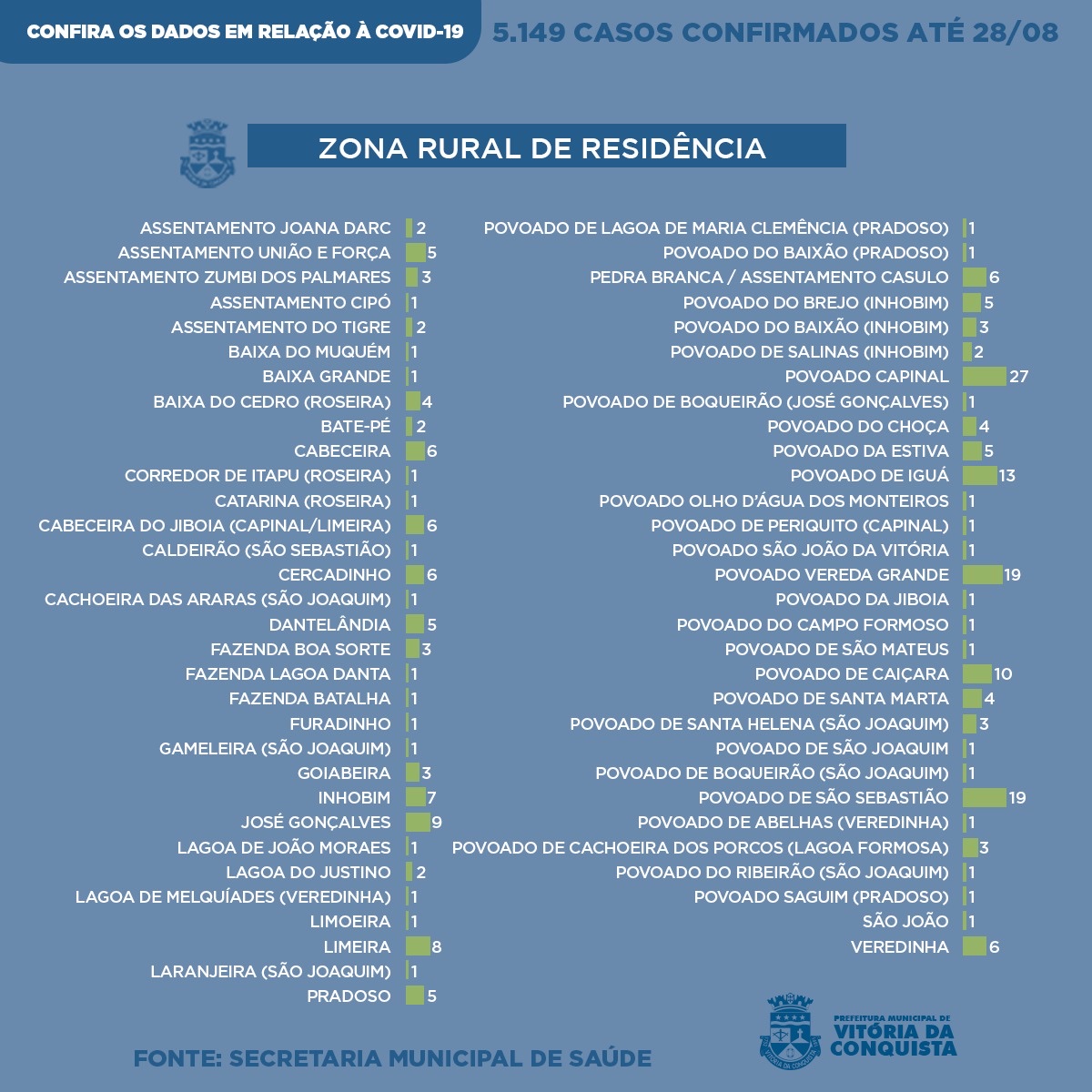 Já na zona rural, foram confirmados 237 casos de moradores que residem nas seguintes localidades: Assentamento Joana Darc (2), Assentamento União e Força (5), Assentamento Zumbi dos Palmares (3), Assentamento Cipó (1), Assentamento Tigre (2), Baixa do Muquem (1), Baixa Grande (1), Baixa do Cedro – Roseira (4), Bate pé (2), Cabeceira (6), Corredor de Itaipu – Roseira (1), Catarina – Roseira (1), Cabeceira da Jiboia – Capinal/Limeira (6), Caldeirão – São Sebastião (1), Cercadinho (6), Cachoeira das Araras – São Joaquim (1), Dantelândia (5), Fazenda Boa sorte (3), Fazenda Lagoa Danta (1), Fazenda Batalha (1), Furadinho (1), Gameleira – São Joaquim (1), Goiabeira (3), Inhobim (7), José Gonçalves (9), Lagoa de João Moraes (1), Lagoa do Justino (2), Lagoa de Melquiades – Veredinha (1), Limoeira (1), Limeira (8), Laranjeira – São Joaquim (1), Pradoso (5), Povoado de Lagoa de Maria Clemência -Pradoso (1), Povoado do Baixão – Pradoso (1), Pedra Branca/Assentamento Casulo (6), Povoado do Brejo – Inhobim (5), Povoado do Baixão – Inhobim (3), Povoado Salinas – Inhobim (2), Povoado Capinal (27), Povoado de Boqueirão – José Gonçalves (1), Povoado do Choça (4), Povoado da Estiva (5), Povoado de Iguá (13), Povoado Olho d’agua dos Monteiros (1), Povoado de Periquito – Capinal (1), Povoado São João da Vitória (1), Povoado Vereda Grande (19), Povoado da Jiboia (1), Povoado Campo Formoso (1), Povoado São Mateus (1), Povoado Caiçara (10), Povoado de Santa Marta (4), Povoado de Santa Helena – São Joaquim (3), Povoado de São Joaquim (1), Povoado de Boqueirão – São Joaquim (1), Povoado de São Sebastião (19), Povoado de Abelhas – Veredinha (1), Povoado de Cachoeira dos Porcos – Lagoa Formosa (3), Povoado de Ribeirão – São Joaquim (1), Povoado Saguim – Pradoso (1), São João (1) e Veredinha (6).