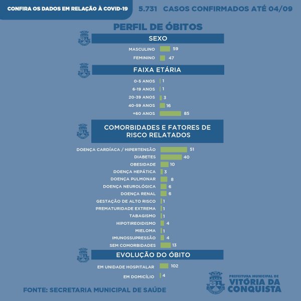 A Secretaria de Saúde registrou, até a última sexta (5), 106 óbitos de pacientes de Conquista, sendo 59 do sexo masculino e 47 do sexo feminino. 102 desses óbitos ocorreram em unidade hospitalar e quatro em domicílio. Quanto à idade dos pacientes, 85 tinham mais de 60 anos, 16 tinham idade entre 40 e 59 anos, três entre 20 e 39 anos, um com idade entre 6 e 19 anos e um recém-nascido prematuro.