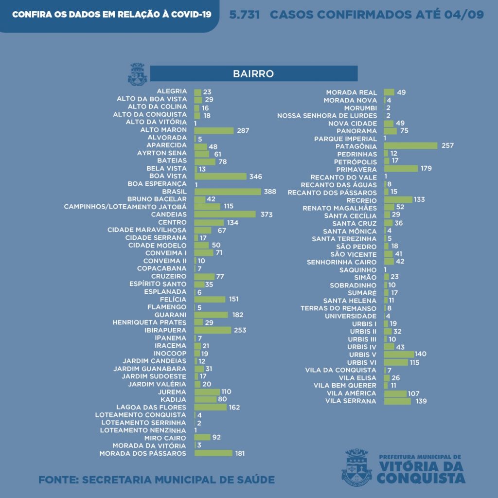 Na zona urbana, 5.454 foram diagnosticados com a Covid-19 de pessoas residentes das seguintes localidades: Alegria (23), Alto da Boa Vista (29), Alto da Colina (16), Alto da Conquista (18), Alto da Vitória (1), Alto Maron (287), Alvorada (5), Aparecida (48), Ayrton Sena (61), Bateias (78), Bela Vista (13), Boa vista (346), Boa Esperança (1), Brasil (388), Bruno Barcelar (42), Campinhos/Loteamento Jatobá (115), Candeias (373), Centro (134), Cidade Maravilhosa (67), Cidade Serrana (17), Cidade Modelo (50), Conveima I (71), Conveima II (10), Copacabana (7), Cruzeiro (77), Espírito Santo (35), Esplanada (6), Felícia (151), Flamengo (5), Guarani (182), Henriqueta Prates (29), Ibirapuera (253), Ipanema (7), Iracema (21), Inocoop (19), Jardim Candeias (12), Jardim Guanabara (31), Jardim Sudoeste (17), Jardim Valéria (20), Jurema (110), Kadija (80), Lagoa das Flores (162), Loteamento Conquista (4), Loteamento Serrinha (2), Loteamento Nenzinha (1), Miro Cairo (92), Morada da Vitória (3), Morada dos Pássaros (181), Morada Real (49), Morada Nova (4), Morumbi (2), Nossa Senhora de Lurdes (2), Nova Cidade (49), Panorama (75), Parque Imperial (1), Patagônia (257), Pedrinhas (12), Petrópolis (17), Primavera (179), Recanto do Vale (1), Recanto das Águas (8), Recanto dos Pássaros (15), Recreio (133), Renato Magalhães (52), Santa Cecília (29), Santa Cruz (36), Santa Mônica (4), Santa Terezinha (5), São Pedro (18), São Vicente (41), Senhorinha Cairo (42), Saquinho (1), Simão (23), Sobradinho (10), Sumaré (17), Santa Helena (11), Terras do Remanso (8), Universidade (4), Urbis I (19), Urbis II (32), Urbis III (10), Urbis IV (43), Urbis V (140), Urbis VI (115), Vila da Conquista (7), Vila Elisa (26), Vila Bem Querer (11), Vila América (107) e Vila Serrana (139).