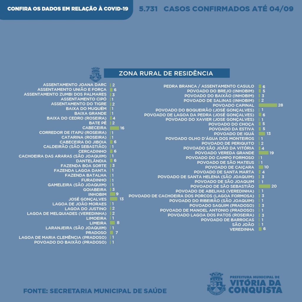 Já na zona rural, foram confirmados 277 casos de moradores que residem nas seguintes localidades: Assentamento Joana Darc (2), Assentamento União e Força (6), Assentamento Zumbi dos Palmares (3), Assentamento Cipó (1), Assentamento Tigre (2), Baixa do Muquem (1), Baixa Grande (1), Baixa do Cedro – Roseira (4), Bate pé (2), Cabeceira (16), Corredor de Itaipu – Roseira (1), Catarina – Roseira (1), Cabeceira da Jiboia – Capinal/Limeira (6), Caldeirão – São Sebastião (1), Cercadinho (6), Cachoeira das Araras – São Joaquim (1), Dantelândia (6), Fazenda Boa sorte (3), Fazenda Lagoa Danta (1), Fazenda Batalha (1), Furadinho (1), Gameleira – São Joaquim (1), Goiabeira (3), Inhobim (9), José Gonçalves (13), Lagoa de João Moraes (1), Lagoa do Justino (2), Lagoa de Melquiades – Veredinha (2), Limoeira (1), Limeira (8), Laranjeira – São Joaquim (1), Pradoso (7), Povoado de Lagoa de Maria Clemência -Pradoso (1), Povoado do Baixão – Pradoso (1), Pedra Branca/Assentamento Casulo (6), Povoado do Brejo – Inhobim (5), Povoado do Baixão – Inhobim (3), Povoado Salinas – Inhobim (2), Povoado Capinal (28), Povoado de Boqueirão – José Gonçalves (1), Povoado Lagoa da Pedra – José Gonçalves (6), Povoado do Xavier – José Gonçalves (1), Povoado do Choça (5), Povoado da Estiva (5), Povoado de Iguá (13), Povoado Olho d’agua dos Monteiros (1), Povoado de Periquito – Capinal (2), Povoado São João da Vitória (4), Povoado Vereda Grande (19), Povoado da Jiboia (1), Povoado Campo Formoso (1), Povoado São Mateus (1), Povoado Caiçara (10), Povoado de Santa Marta (4), Povoado de Santa Helena – São Joaquim (3), Povoado de São Joaquim (1), Povoado de São Sebastião (20), Povoado de Abelhas – Veredinha (1), Povoado de Cachoeira dos Porcos – Lagoa Formosa (3), Povoado de Ribeirão – São Joaquim (1), Povoado Saguim – Pradoso (3), Povoado de Manoel Antônio – Pradoso (1), Povoado Lagoa dos Patos – Roseira (3), Povoado de Barrocas (1), São João (1) e Veredinha (6).
