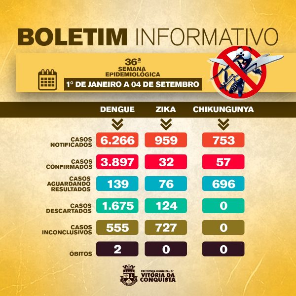 Nesta terça (8), o Centro de Controle de Endemias divulgou a atualização do boletim semanal informativo acerca dos dados epidemiológicos da Dengue, Zika e Chikungunya em Vitória da Conquista até a 36ª semana epidemiológica – referente ao período de janeiro a 4 de setembro de 2020.