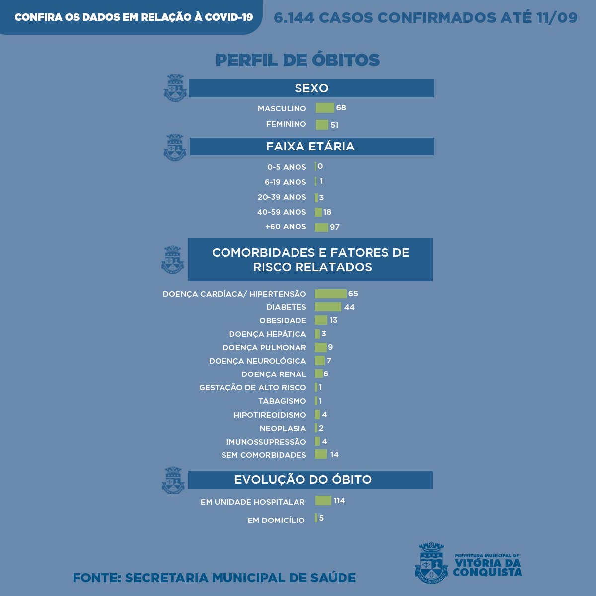 Na última semana, a Secretaria de Saúde divulgou mais 13 falecimentos de pacientes do município, totalizando 119 óbitos (68 do sexo masculino e 51 do sexo feminino), sendo que 114 ocorreram em unidade hospitalar e cinco em domicílio. Dessas pessoas que vieram a óbito, 97 tinham mais de 60 anos, 18 tinham idade entre 40 e 59 anos, três entre 20 e 39 anos e uma com idade entre 6 e 19 anos.