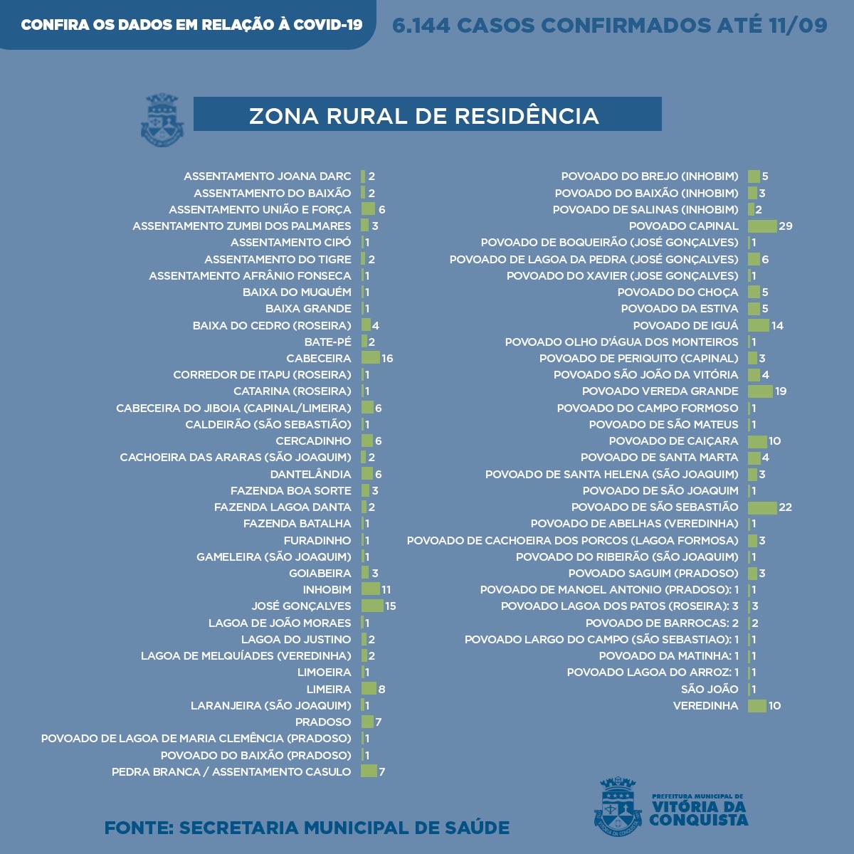 Enquanto que na zona rural foram confirmados 300 casos de residentes das seguintes localidades: Assentamento Joana Darc (2), Assentamento União e Força (6), Assentamento Zumbi dos Palmares (3), Assentamento Cipó (1), Assentamento Tigre (2), Assentamento Baixão (2), Assentamento Afrânio Fonseca (1), Baixa do Muquem (1), Baixa Grande (1), Baixa do Cedro – Roseira/José Gonçalves (4), Bate pé (2), Cabeceira (16), Corredor de Itaipu – Roseira (1), Catarina – Roseira (1), Cabeceira da Jiboia – Capinal/Limeira (6), Caldeirão – São Sebastião (1), Cercadinho (6), Cachoeira das Araras – São Joaquim (2), Dantelândia (6), Fazenda Boa sorte (3), Fazenda Lagoa Danta (2), Fazenda Batalha (1), Furadinho (1), Gameleira – São Joaquim (1), Goiabeira (3), Inhobim (11), José Gonçalves (15), Lagoa de João Moraes (1), Lagoa do Justino (2), Lagoa de Melquiades – Veredinha (2), Limoeira (1), Limeira (8), Laranjeira – São Joaquim (1), Pradoso (7), Povoado de Lagoa de Maria Clemência -Pradoso (1), Povoado do Baixão – Pradoso (1), Pedra Branca/Assentamento Casulo (7), Povoado do Brejo – Inhobim (5), Povoado do Baixão – Inhobim (3), Povoado Salinas – Inhobim (2), Povoado Capinal (29), Povoado de Boqueirão – José Gonçalves (1), Povoado Lagoa da Pedra – José Gonçalves (6), Povoado do Xavier – José Gonçalves (1), Povoado do Choça (5), Povoado da Estiva (5), Povoado de Iguá (14), Povoado Olho d’agua dos Monteiros (1), Povoado de Periquito – Capinal (3), Povoado São João da Vitória (4), Povoado Vereda Grande (19), Povoado Campo Formoso (1), Povoado São Mateus (1), Povoado Caiçara (10), Povoado de Santa Marta (4), Povoado de Santa Helena – São Joaquim (3), Povoado de São Joaquim (1), Povoado de São Sebastião (22), Povoado de Abelhas – Veredinha (1), Povoado de Cachoeira dos Porcos – Lagoa Formosa (3), Povoado de Ribeirão – São Joaquim (1), Povoado Saguim – Pradoso (3), Povoado de Manoel Antônio – Pradoso (1), Povoado Lagoa dos Patos – Roseira (3), Povoado de Barrocas (2), Povoado Largo do Campo – São Sebastião (1), Povoado da Matinha (1), Povoado Lagoa do Arroz (1), São João (1) e Veredinha (10).