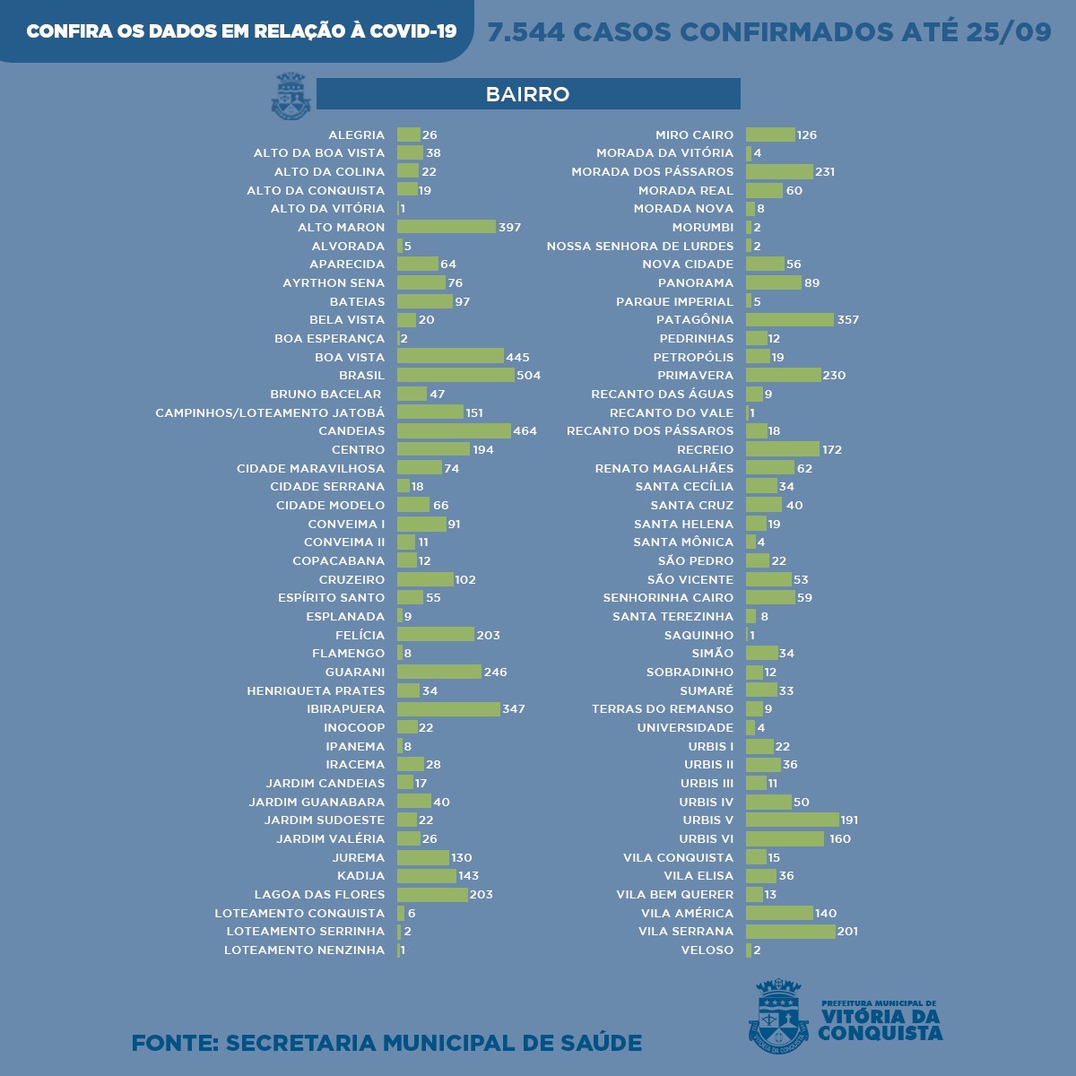Na zona urbana foram diagnosticados 7.168 casos da Covid-19 de moradores das localidades citadas na tabela abaixo: