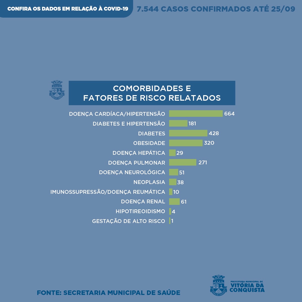 Os pacientes relataram uma ou mais comorbidades – quando há duas ou mais doenças preexistentes – ou fatores de risco para a Covid-19: Doença Cardíaca/Hipertensão (664), Diabetes e Hipertensão (181), Diabetes (428), Obesidade (320), Doença Hepática (29), Doença Pulmonar (271), Doença Neurológica (51), Neoplasia (38), Imunossupressão/Doença Reumática (10), Doença Renal (61), Hipotireoidismo (4) e Gestação de alto risco (1).