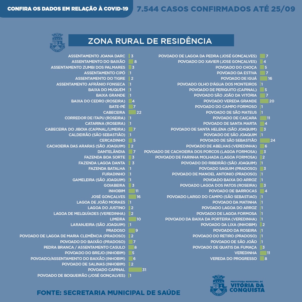 Já na zona rural foram confirmados 376 casos de pacientes moradores das seguintes localidades: