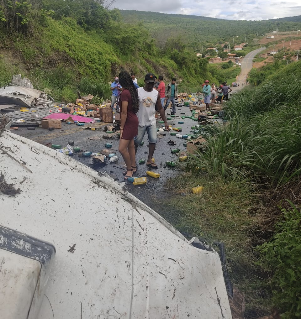 O caminhão em que eles estavam capotou e espalhou a carga na pista.
