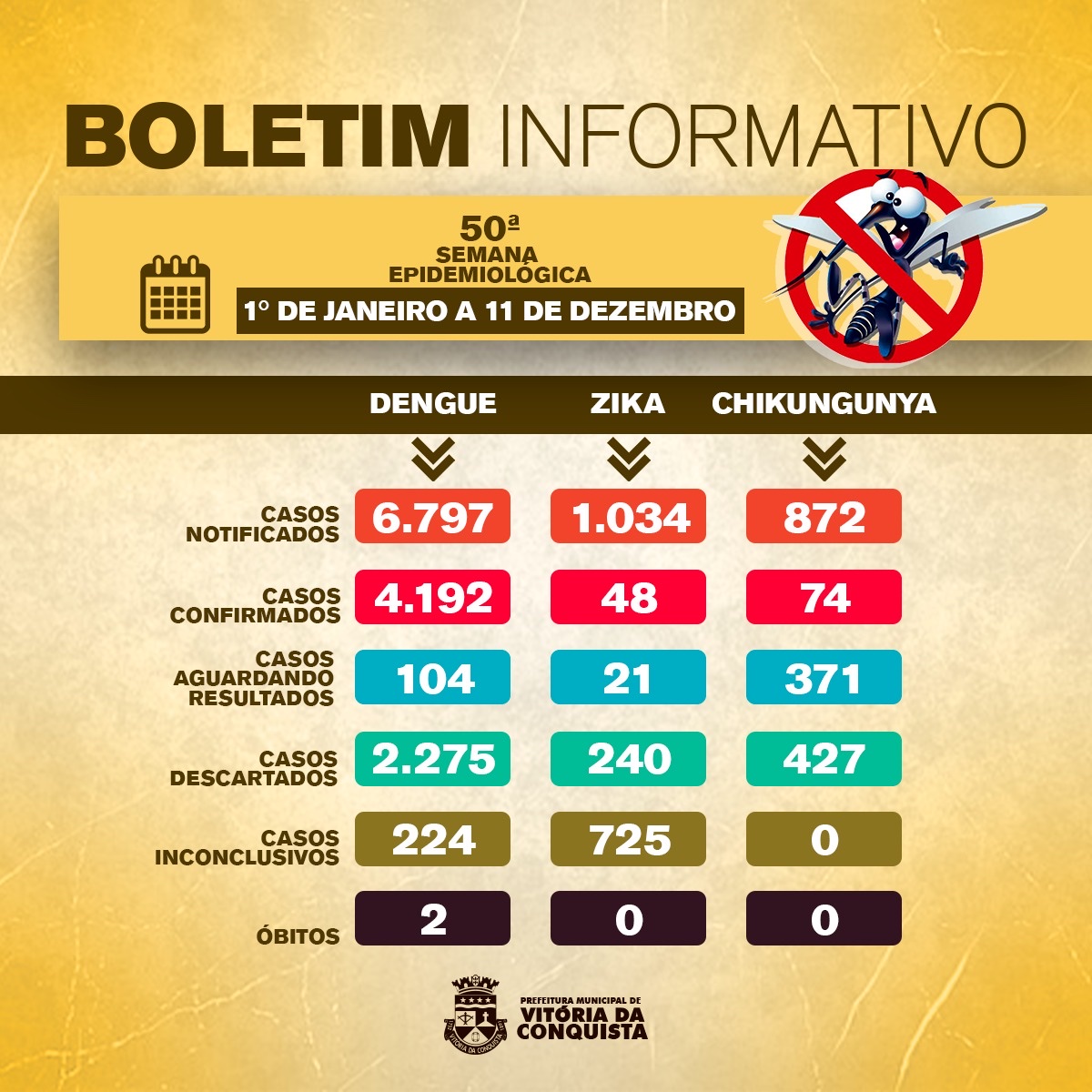 Foi divulgado nesta terça-feira (15) a atualização do boletim informativo das arboviroses (Dengue, Zika e Chikungunya) em Conquista. Os dados são da 50ª semana epidemiológica, que compreende o período de janeiro a 11 de dezembro deste ano.