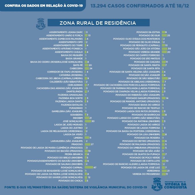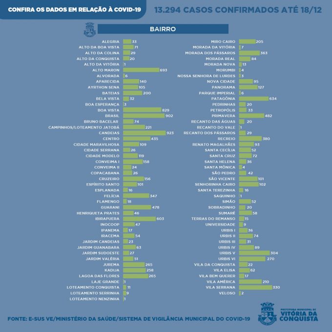 Na zona urbana de Vitória da Conquista, foram registrados 12.662 pacientes da Covid-19, moradores das seguintes localidades: