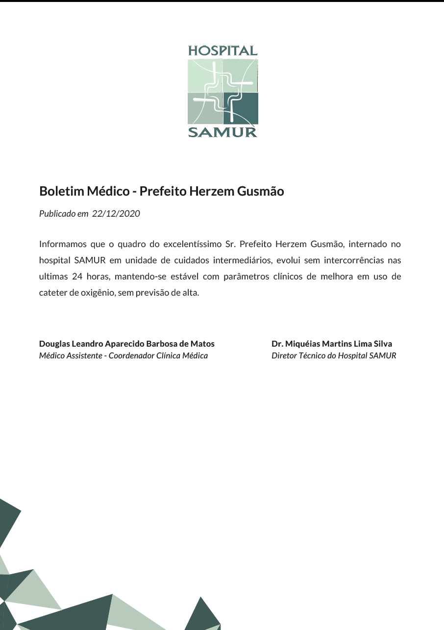 O prefeito Herzem Gusmão segue em tratamento no Hospital Samur sem previsão de alta.