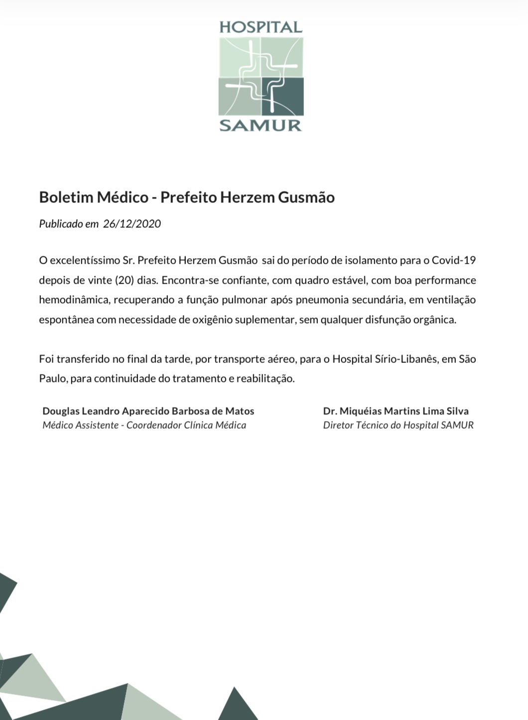 Após ser diagnosticado com Covid 19 no dia (07), o prefeito Herzem Gusmão seguiu em tratamento domiciliar nos primeiros dias da doença, respondendo bem ao tratamento. No dia 18, foi indicada a necessidade de internação em unidade hospitalar.