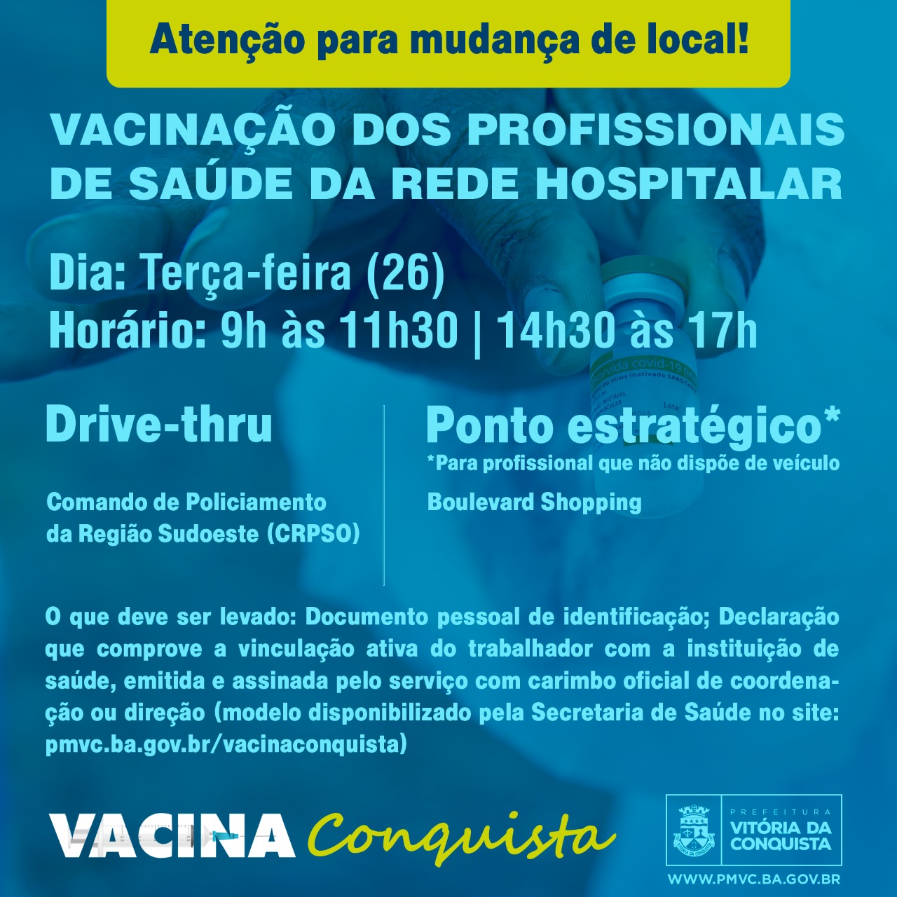 A Secretaria Municipal de Saúde informa que, por questões operacionais, a vacinação dos trabalhadores da saúde da rede hospitalar que iria acontecer no 9º Batalhão de Polícia Militar foi transferida para o Boulevard Shopping, na Avenida Olívia Flores.