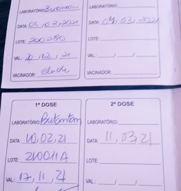 As imagens dos cartões de vacina circularam nas redes sociais, nesta quinta-feira (11).