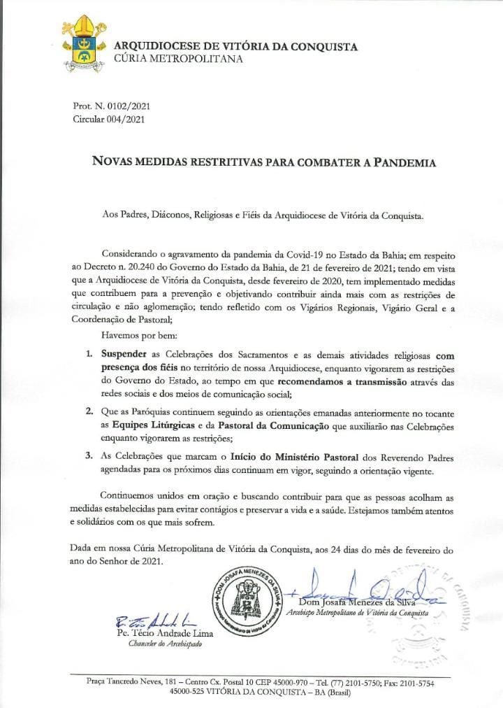 A Arquidiocese de Vitória da Conquista informou, no início da noite desta quarta-feira (24), que estão suspensas as Celebrações dos Sacramentos e as demais atividades religiosas com presença dos fiéis no território de nossa Arquidiocese, enquanto vigorarem as restrições do Governo do Estado.