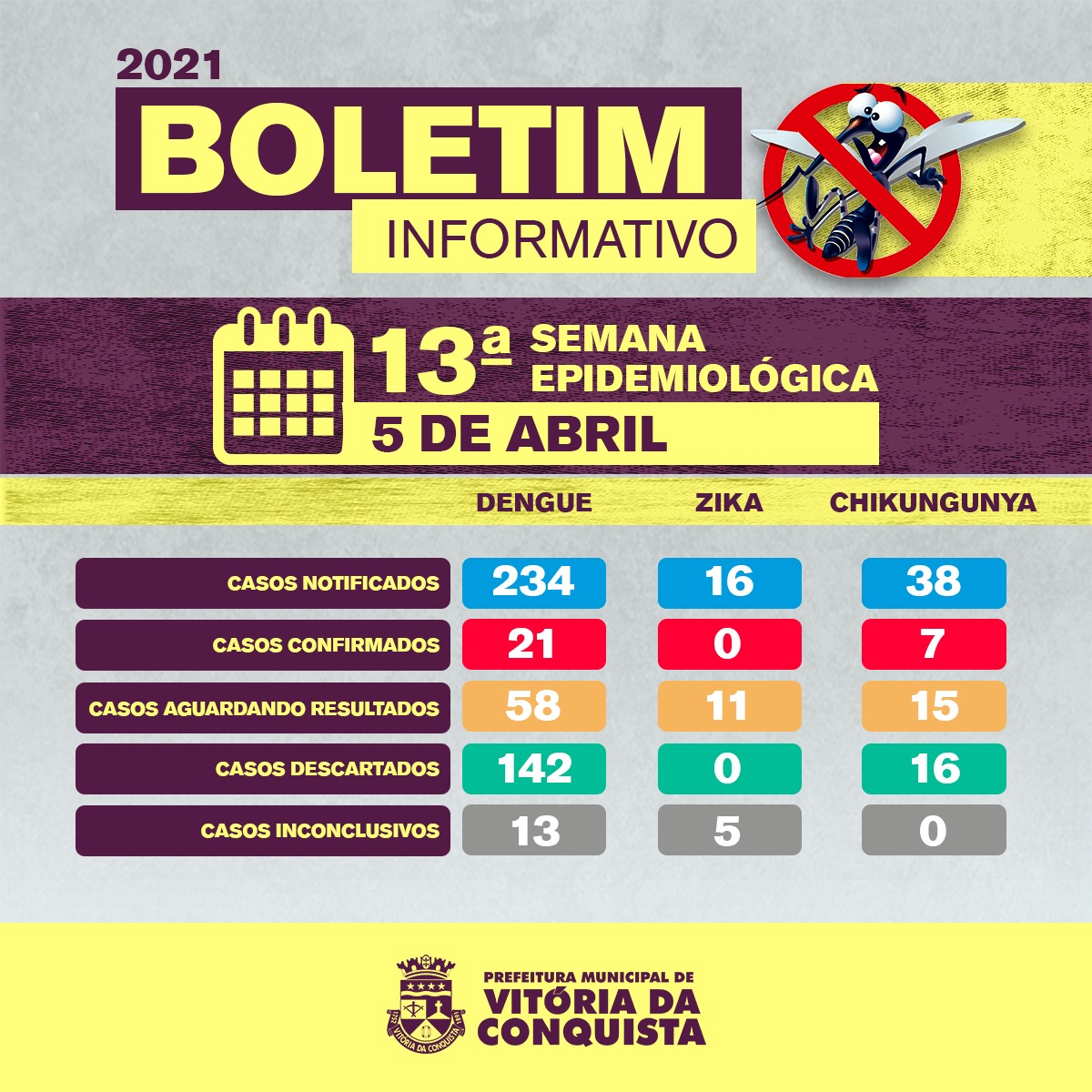 O Centro de Controle de Endemias divulgou a atualização do Boletim informativo das notificações de Dengue, Zika e Chikungunya em Vitória da Conquista, do período de janeiro a 5 de abril – referente à 13ª semana epidemiológica.