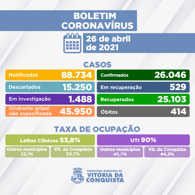 414º óbito: mulher, 62 anos residente no Bairro Alto Maron e portadora de doença cardiovascular crônica e diabetes melito. Foi internada no Hospital Geral de Vitória da Conquista (HGVC) no dia 06/04, onde faleceu também em 25/04.