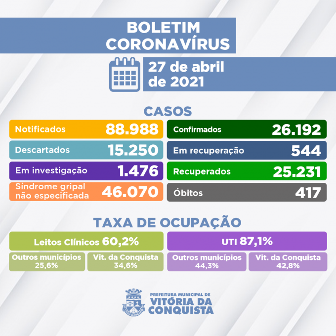 417º óbito – Mulher, 83 anos, moradora do bairro Urbis III, portadora de Hipertensão Arterial, Diabetes e Infecção do Trato Urinário Recorrente. Estava internada no Hospital Geral de Vitória da Conquista (HGVC) desde o dia 04 de abril, onde veio a falecer no dia 25.