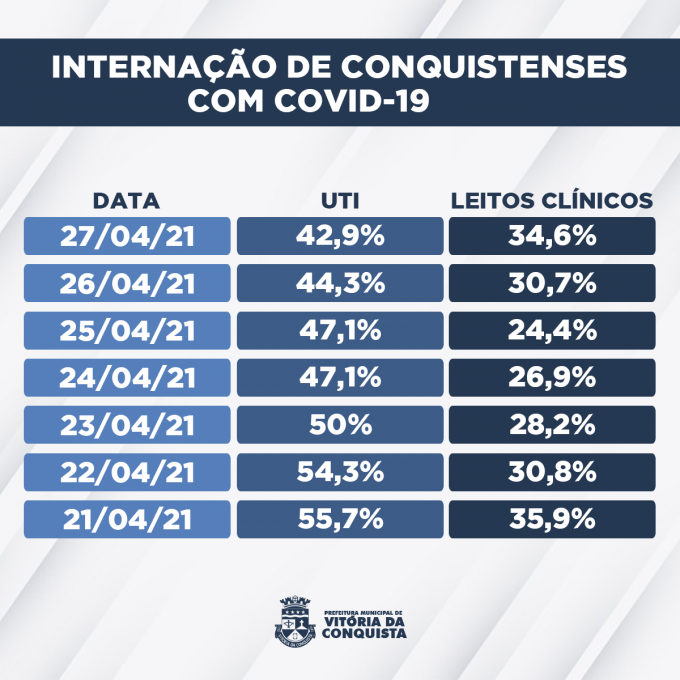 Em relação à internação de moradores de Vitória da Conquista com suspeita ou confirmação de Covid-19, os dados mostram redução, pelo sétimo dia seguido, na ocupação de leitos de UTI.