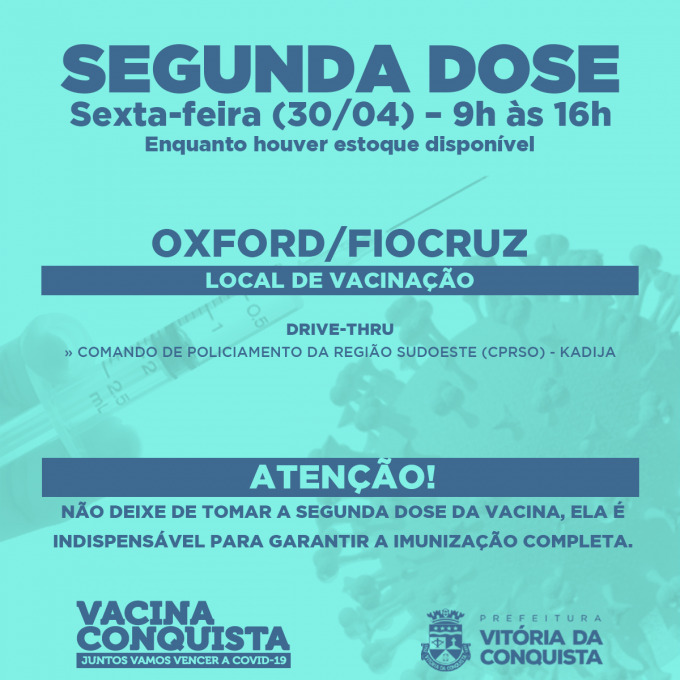 Também será retomada a aplicação da segunda dose da Oxford/Fiocruz, das 9h às 16h, no Comando de Policiamento da Região Sudoeste (CPRSO), no bairro Kadija, por meio do drive-thru.
