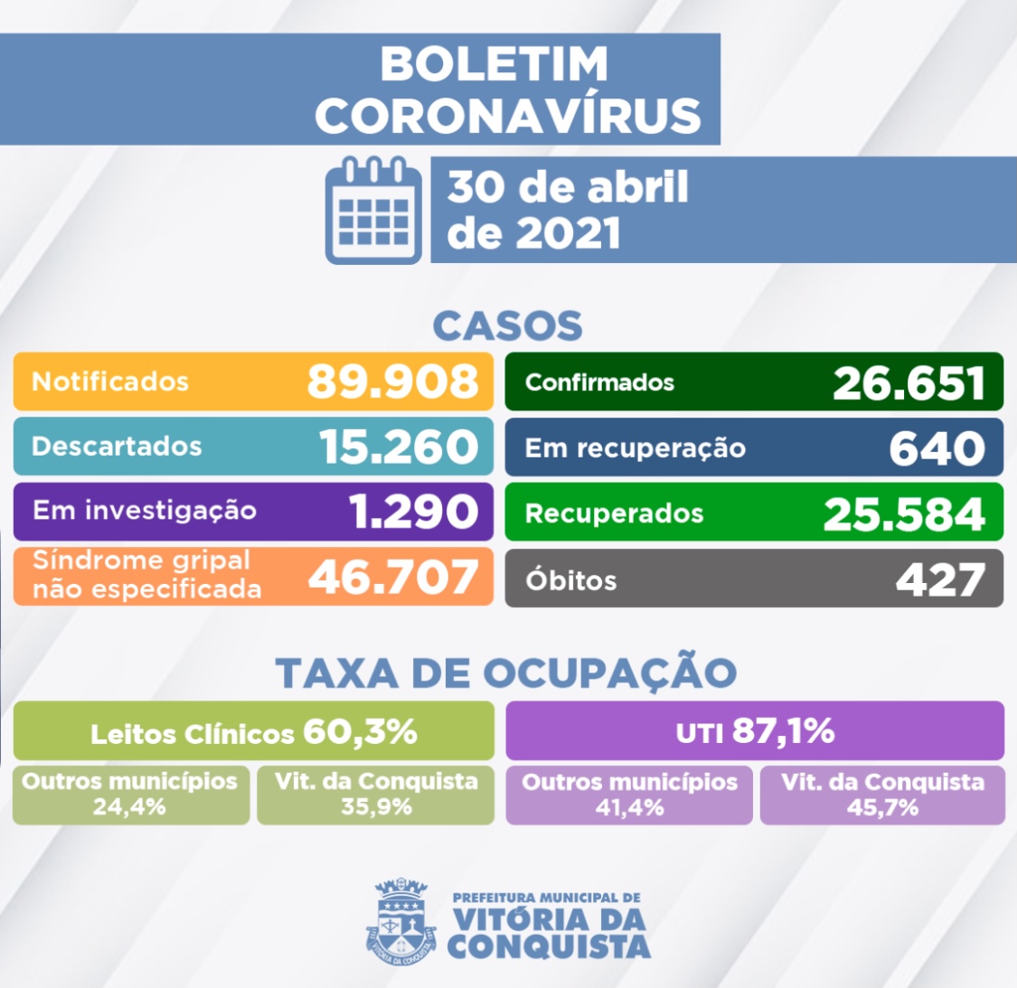 O boletim epidemiológico publicado nesta sexta-feira (30) contabiliza 26.651 pessoas que já se infectaram com a Covid-19 em Vitória da Conquista. Desse total, 25.584 já estão recuperadas e 640 pacientes seguem em recuperação – 79 internados e 561 em tratamento domiciliar.