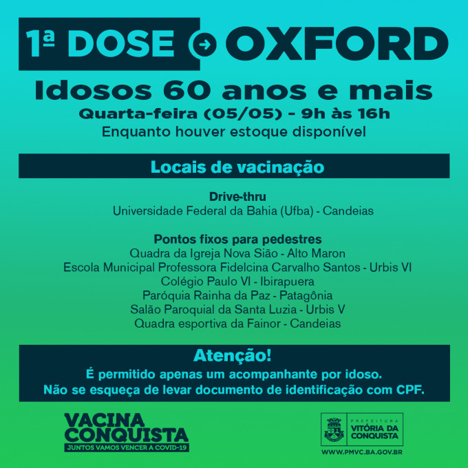 Continuação – A vacinação de 1ª doses de idosos de 60 anos ou mais será continuada nesta quarta-feira e, em paralelo, estará acontecendo a vacinação de 2ª dose do imunizante Oxford/Fiocruz para aquelas pessoas com retorno marcado no cartão de vacina para o dia 5 de maio.