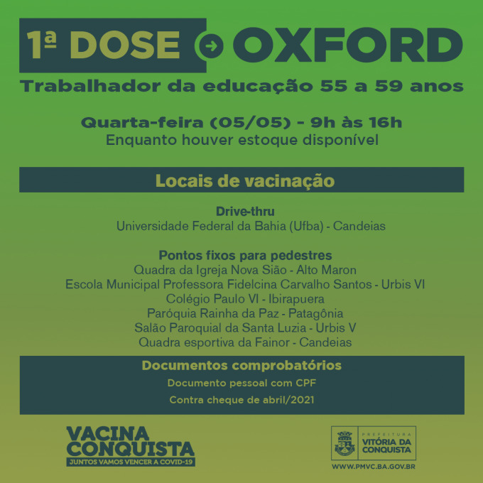A campanha de vacinação contra a Covid-19 será ampliada para a segunda fase, nesta quarta-feira (5), em Vitória da Conquista. Com 9.600 doses da vacina de Oxford/Fiocruz recebidas nesta feira serão imunizados trabalhadores da Educação de 55 a 59 anos, e pessoas com doenças crônicas e condições clínicas especiais de 18 a 59 anos, incluindo, nesta etapa, apenas transplantados, pessoas com Síndrome de Down e Imunossupressão. Além disso, haverá a continuidade da vacinação dos idosos de 60 anos ou mais.