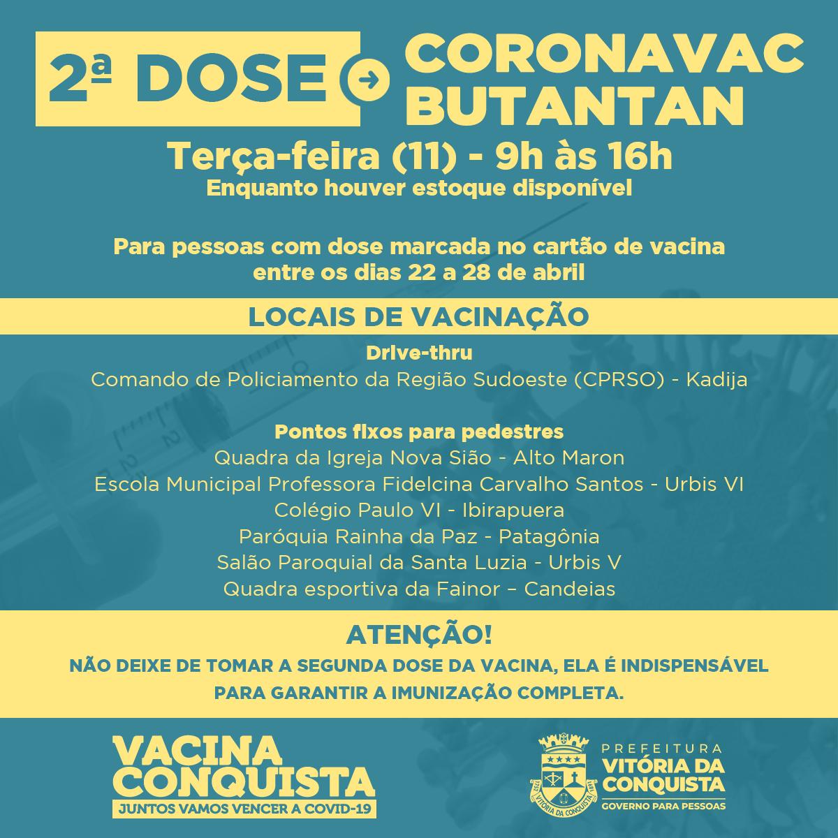 Nesta terça-feira (11), a secretaria de saúde de Vitória da Conquista seguirá com a aplicação da 2ª dose do imunizante Coronavac/Butantan para aquelas pessoas com retorno marcado no cartão de vacina entre os dias 22 a 28 de abril.