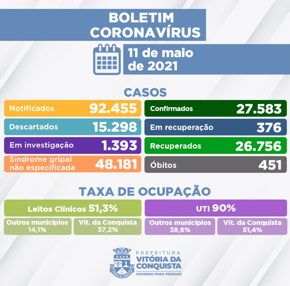 Vitória da Conquista registrou, até esta terça-feira (11), o total de 27.583 casos confirmados da Covid-19. Destes, 26.756 estão recuperados e 376 continuam em recuperação, com 76 internados e 300 em tratamento domiciliar. Desde o mês de março de 2020, 451 pessoas foram a óbito por causa da doença.