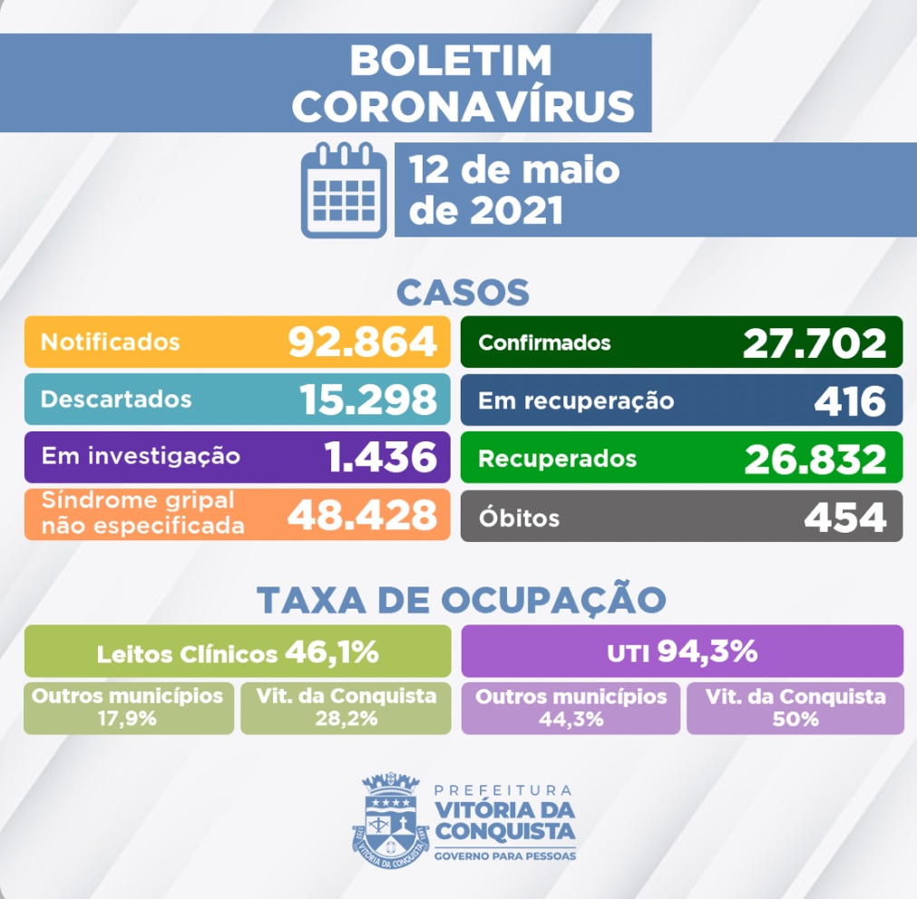Em Vitória da Conquista, foram confirmados 27.702 casos da Covid-19, segundo boletim epidemiológico atualizado nesta quarta-feira (12). Das pessoas que se infectaram, 26.832 já estão recuperadas e 416 sintomáticos seguem em recuperação – 66 internados em Vitória da Conquista e 350 em tratamento domiciliar.