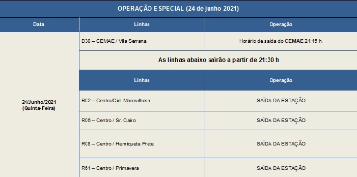 A Secretaria de Mobilidade Urbana (Semob), por meio da Coordenação de Transporte Público, informa que nesta quinta-feira (24), feriado de São João, o transporte coletivo urbano de Vitória da Conquista estará operando com o quadro de horário de domingo. As linhas, na tabela abaixo, também tiveram seus últimos horários alterados.