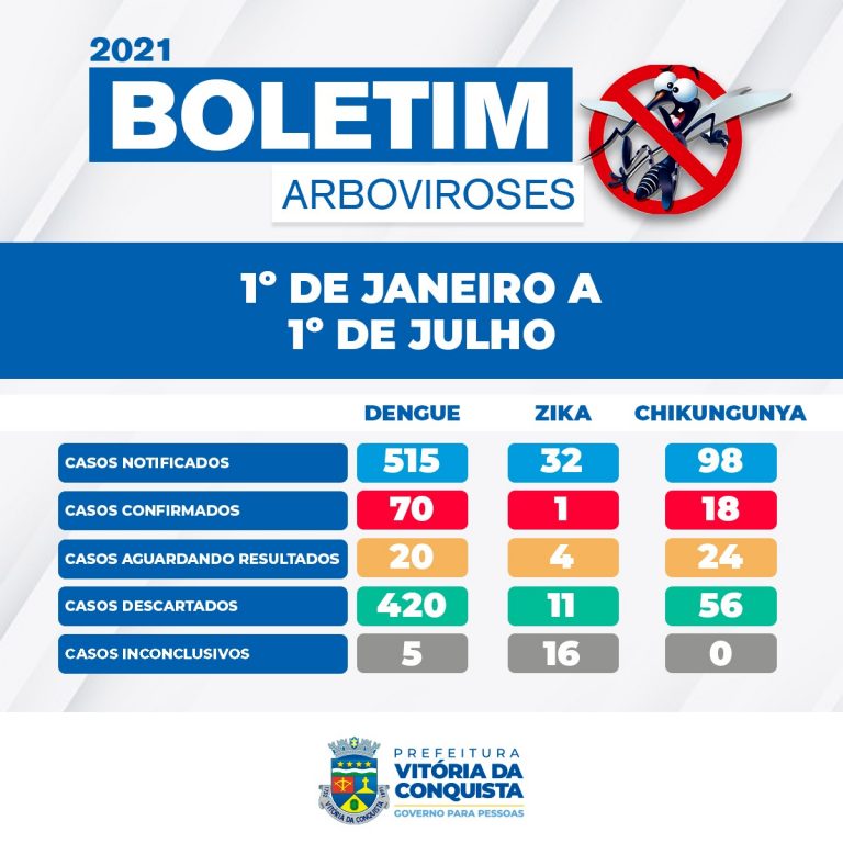 De acordo com o boletim epidemiológico das arboviroses, atualizado pelo Centro de Controle de Endemias, nos seis primeiros meses de 2021 foram registrados 89 casos confirmados da dengue, zika e chikungunya em Vitória da Conquista.
